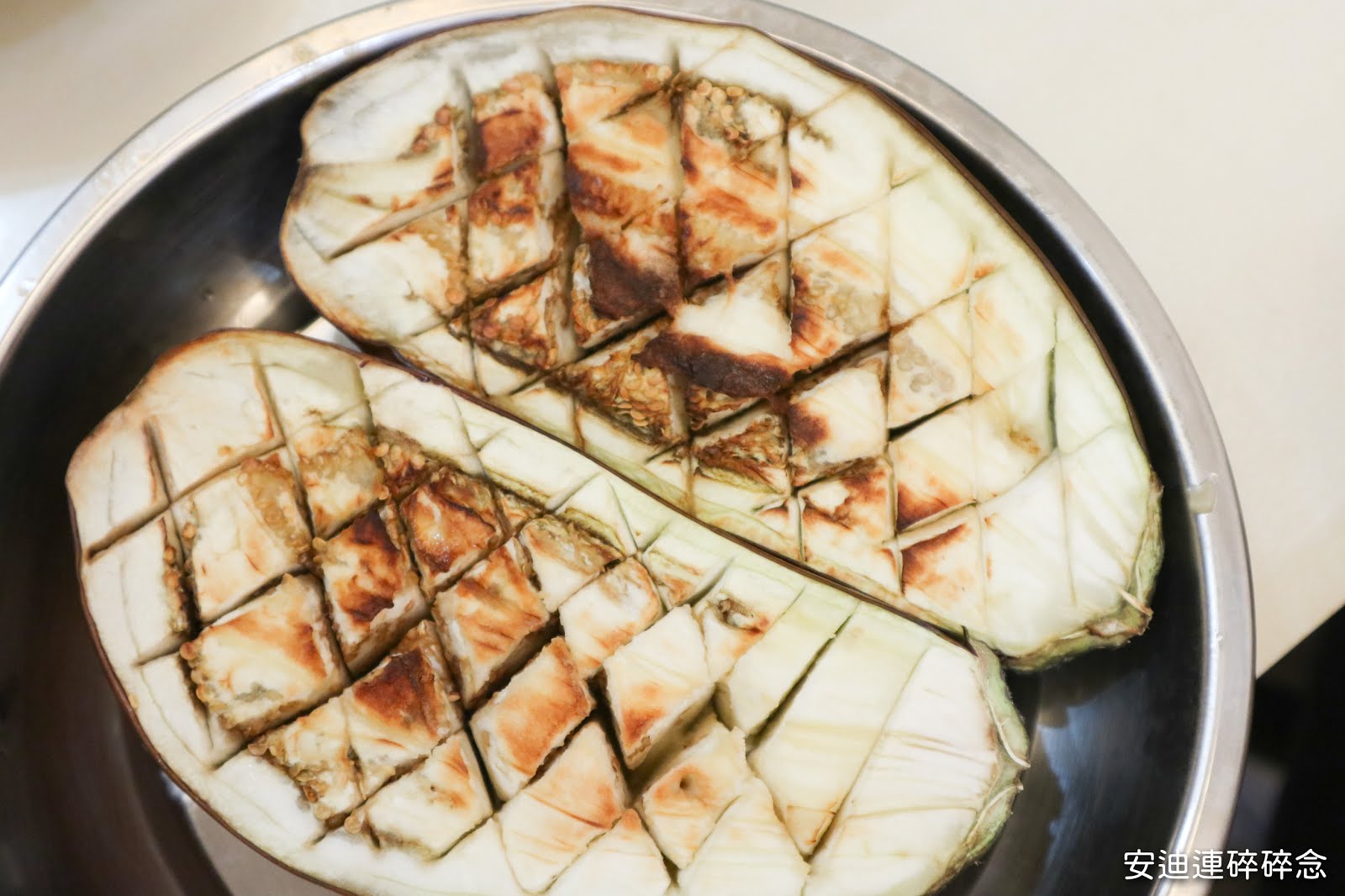 ▼茄子對半切開,並用刀子畫出紋路幫助醬汁更加入味。