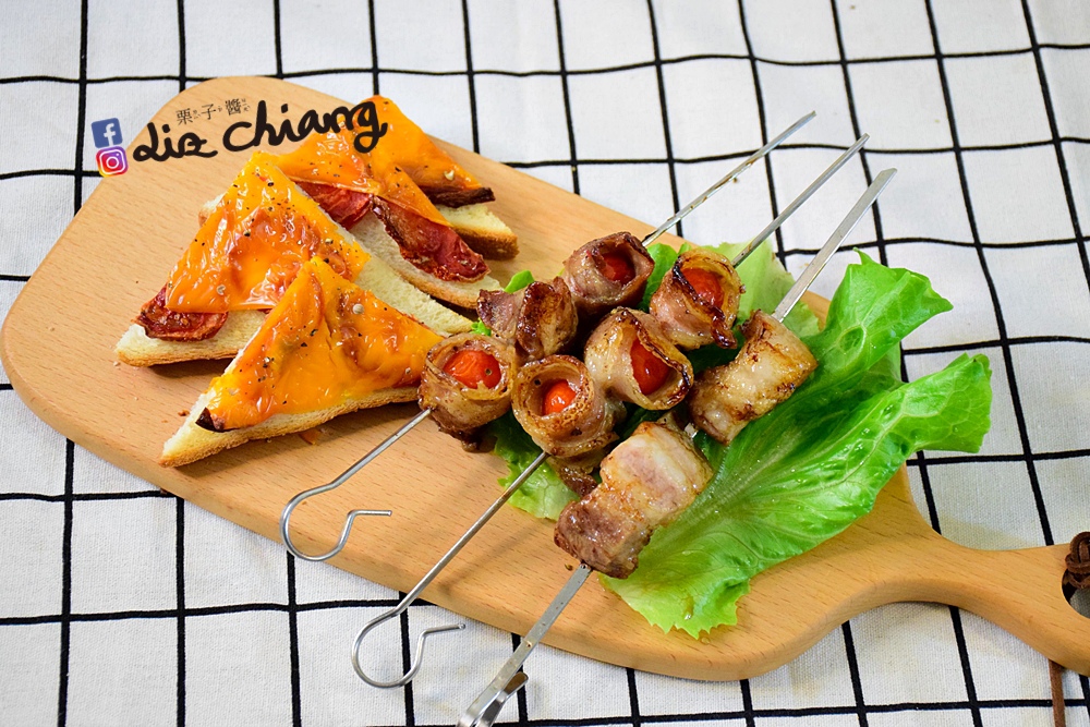 我們在家烤了燒肉串、用了豬五花、豬肉番茄串。