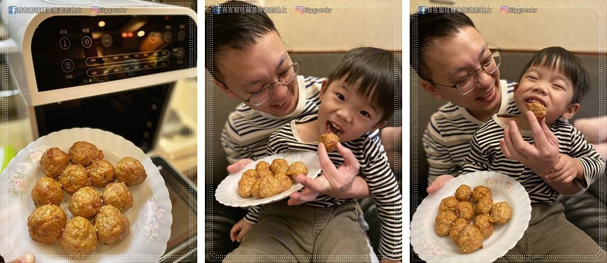 剛氣炸烤好的雞肉丸超膨、超可愛,可以鎖住雞肉丸的原汁原味,外酥內嫩