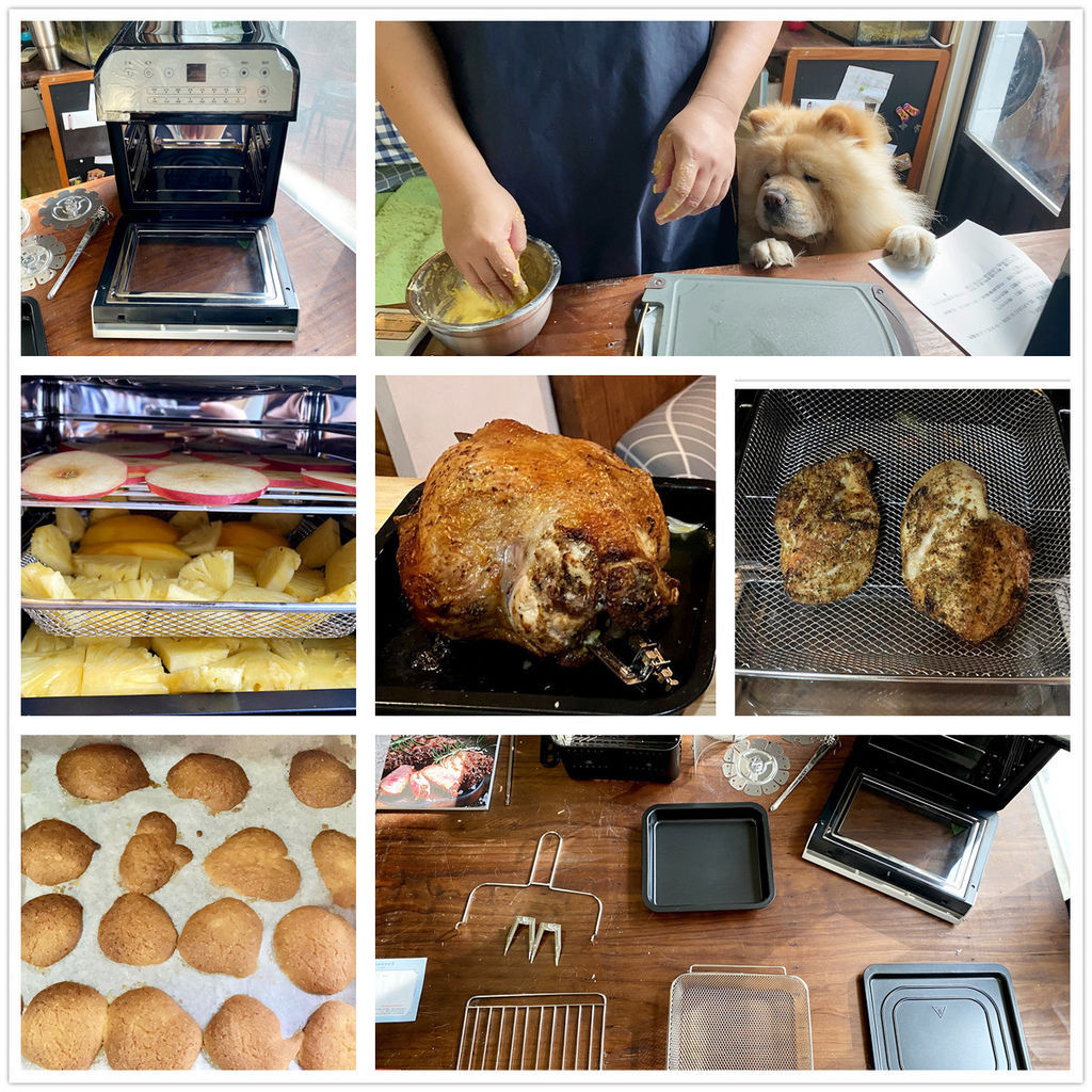 觸控面板上有16種智能預設的菜單選項,豬排、解凍、雞翅、乾果、牛排、薯條、烤魚、蔬菜、烤蝦、全雞、蛋糕、串燒、披薩、保溫、麵包、餅乾,只要輕輕按鍵就可以簡單操作無需顧火候,就算是兩隻熊這樣不太會做菜的人也可以輕鬆的操作。