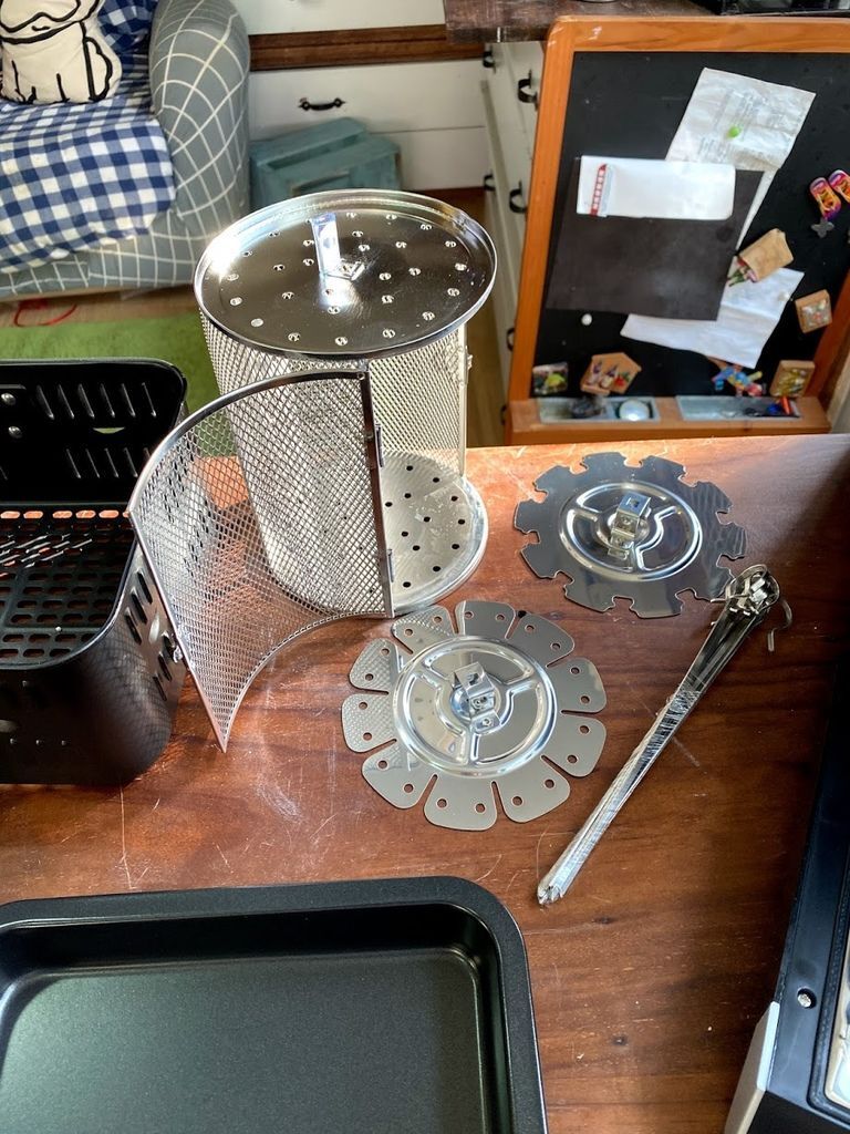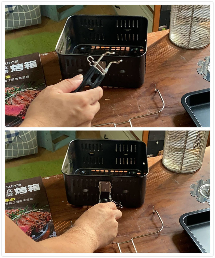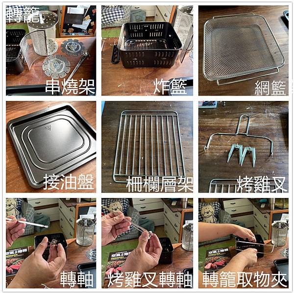 配件的部分存放在機身當中,基本的配件有很多,接油盤、炸籃、炸籃把手、烤雞叉、轉軸、轉籠取物夾,烤盤、網籃、柵欄層架,這次還附贈了活動加贈的轉籠跟串燒架的精美配件一盒,串燒架看起來有點複雜乍看不好組裝,其實只要用過一次就能馬上上手,每個配件都等於一種料理方式功能,就像是把各大幫派武功都練成的一個武功天才一樣,讓兩隻熊迫不及待的想要使用它。