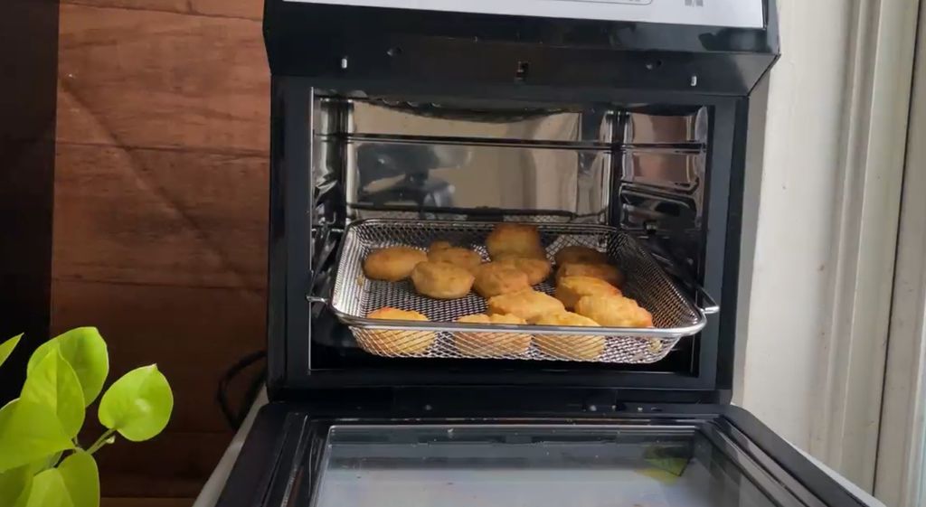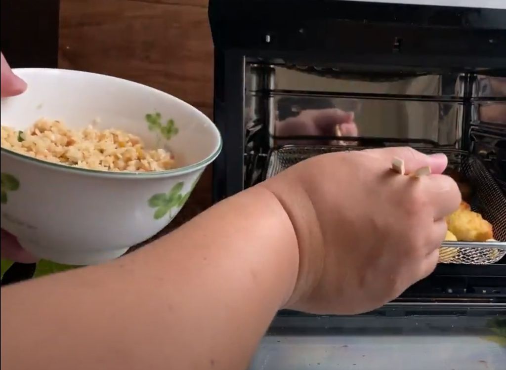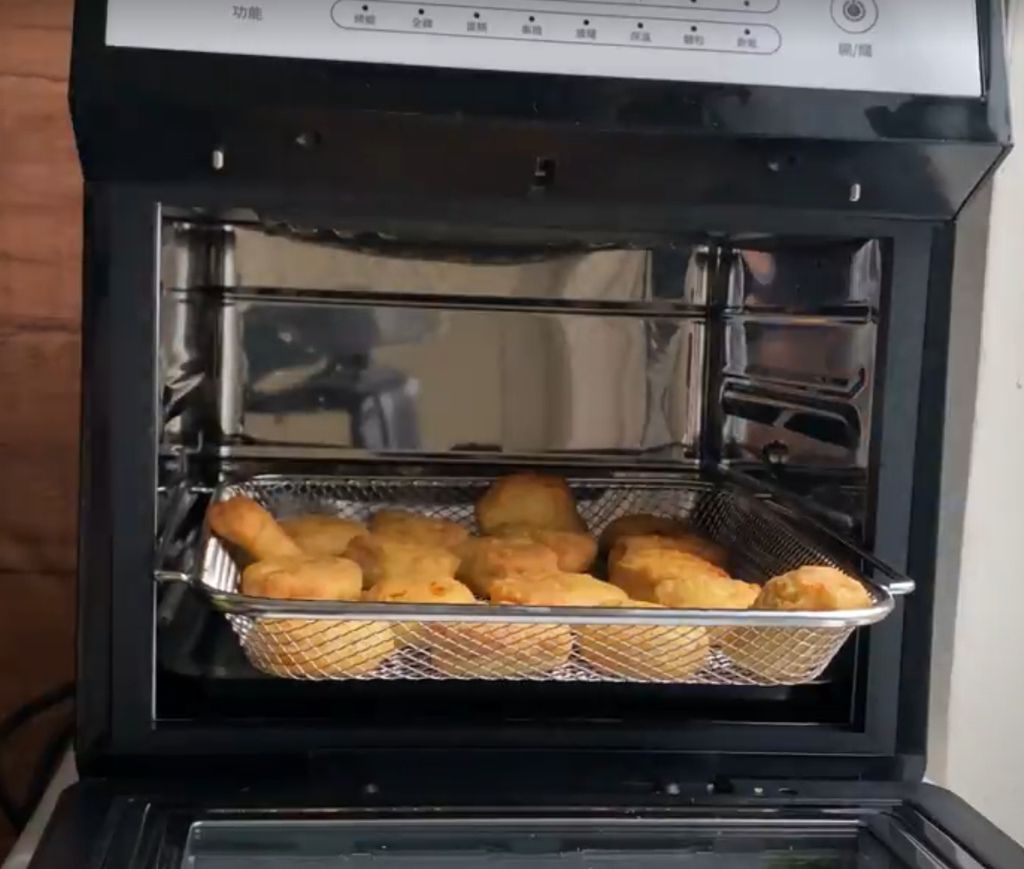 吃紅龍炸雞塊可以吃一整袋,因為可以同時炸的份量變多,分兩批炸全家就可以吃到爽了,今天來吃個炸雞塊蓋飯,分明是要吃炸雞塊又想吃炒飯怎麼辦,先用微波爐把便利商店買回來的冷凍炒飯熱起來等,然後把炸雞放進 山水氣炸烤箱 中完全不放油(達成減油料理的健康吃法),選擇炸薯條的選項,只要20分鐘炸好炸滿,然後把炸雞撲滿炒飯上面,就變成麥當勞等級的紅龍炸雞蓋飯(並沒有這道菜)。