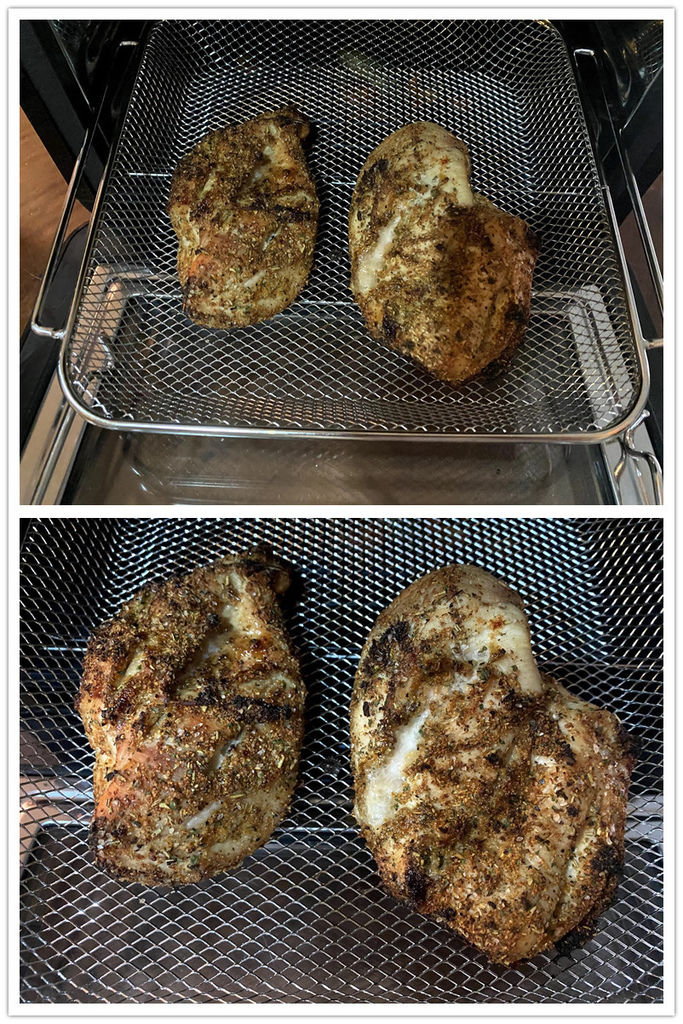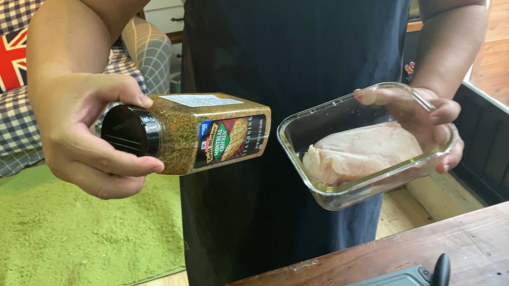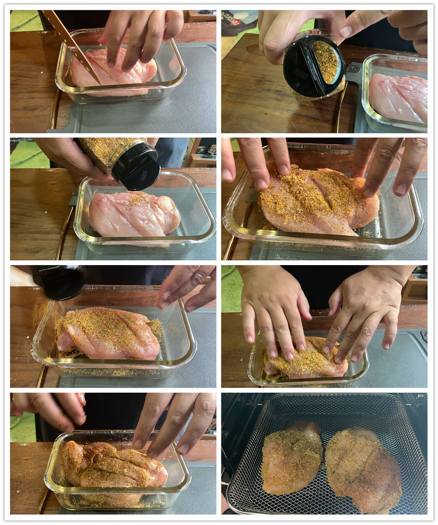 雞胸肉上切三刀,再搭配網友介紹 從COSTCO 買的蒙特婁雞肉調味粉兩面塗抹(調味料內已經含有鹽了),灑多一點粉可以順便將肉汁鎖住,就可以放入烤箱中烘烤了。(以烤全雞的時間200度30分鐘)