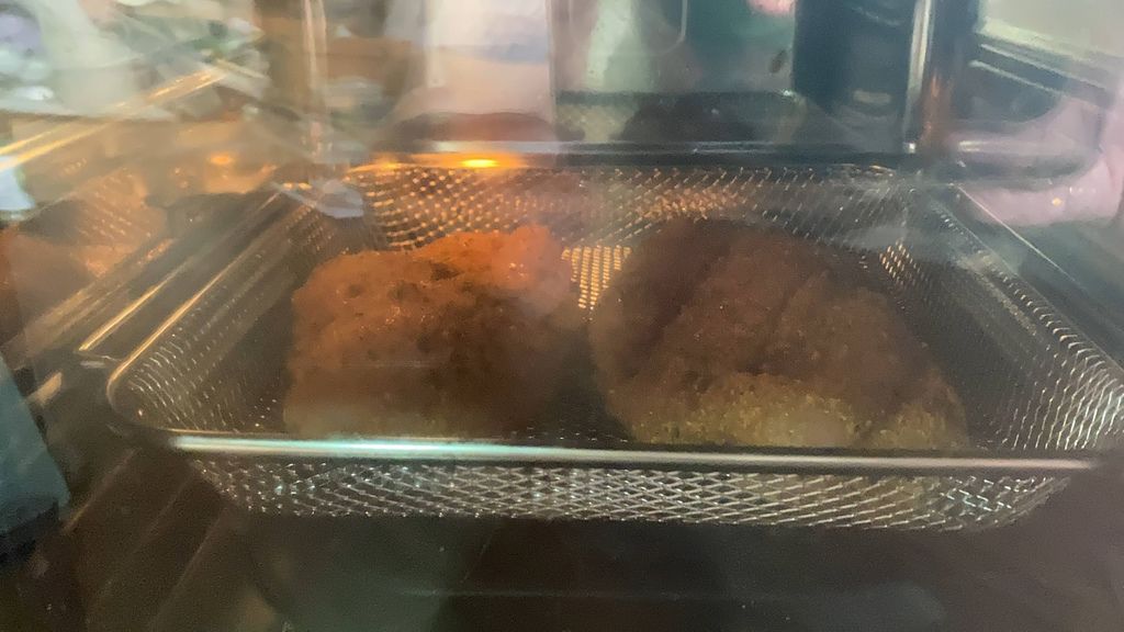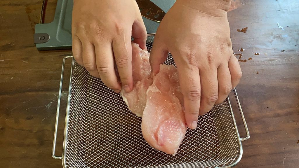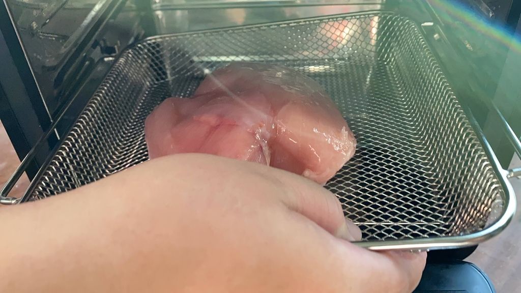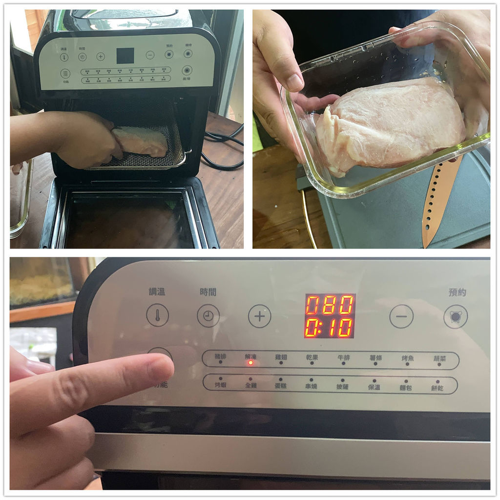 從COSTCO 買回來的雞胸肉,因為前一天冷凍在冰庫,因為採用-21度C 冷凍所以特別硬梆梆,雞胸肉採用兩次解凍的方式,放入 山水氣炸烤箱 按一次解凍然後翻面再解凍一次就可以完全解凍了。