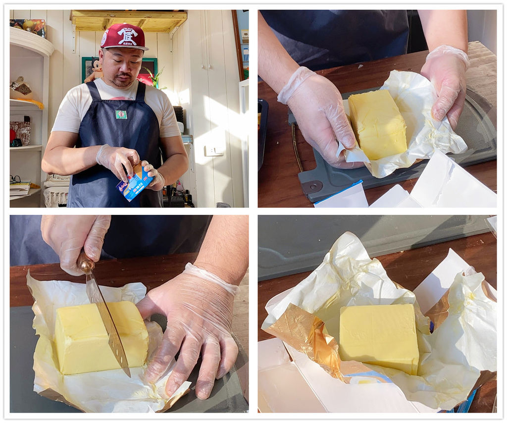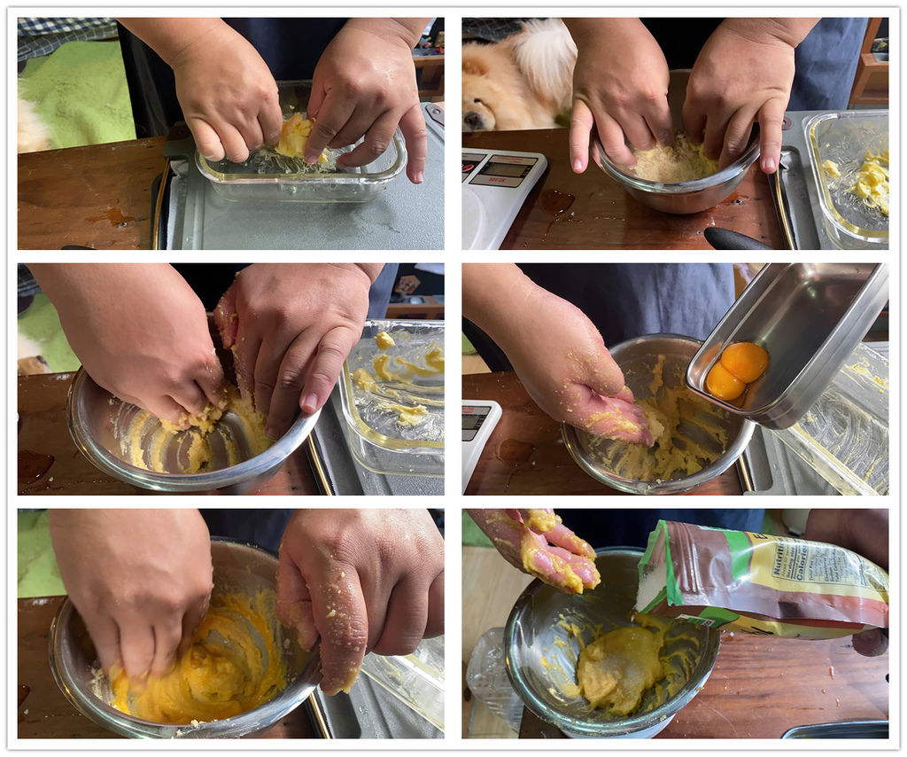 杏仁粉40克放入容器中,將奶油40克也放進去切小塊然後捏軟,靠手心的溫度融化他,然後加入赤藻醣醇分兩次加入,再把蛋黃加進去捏均勻。