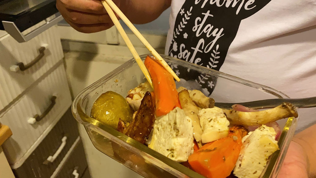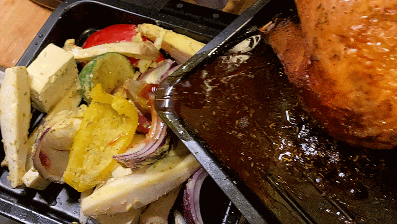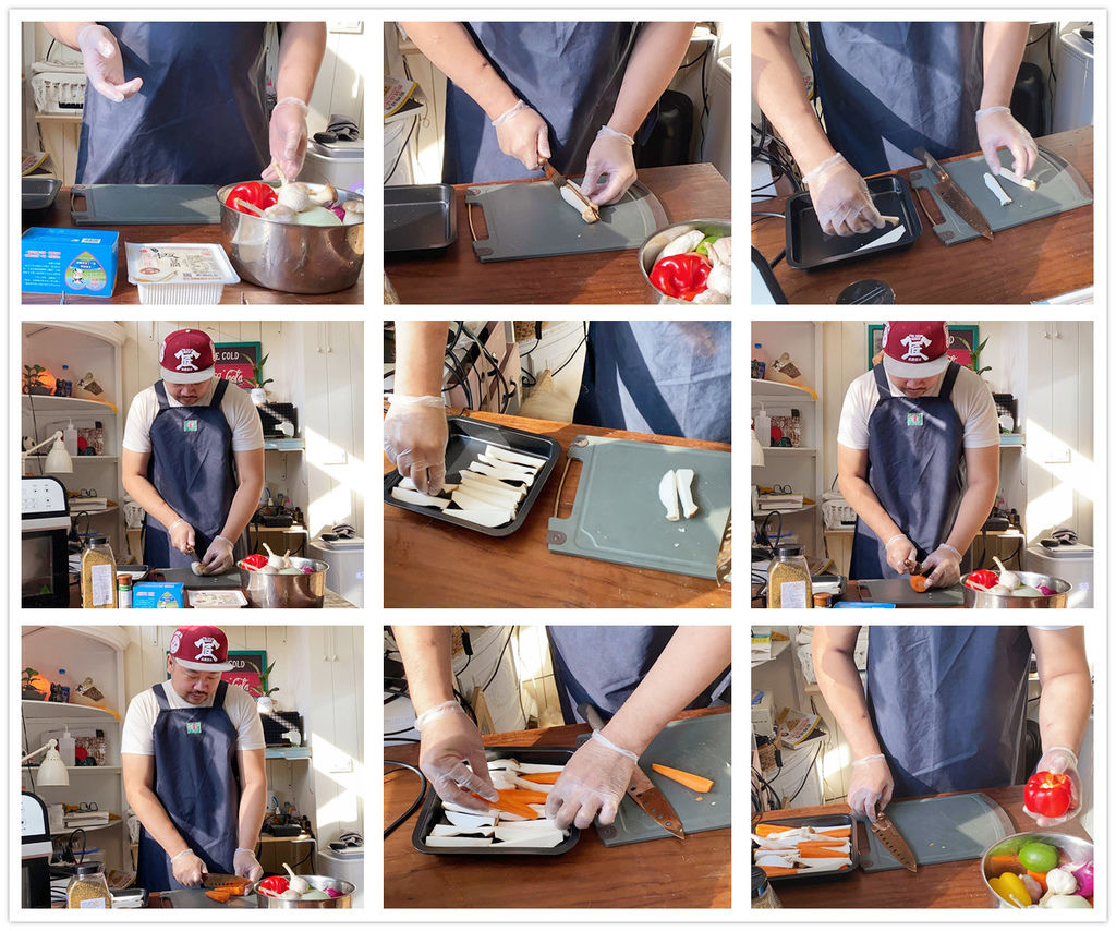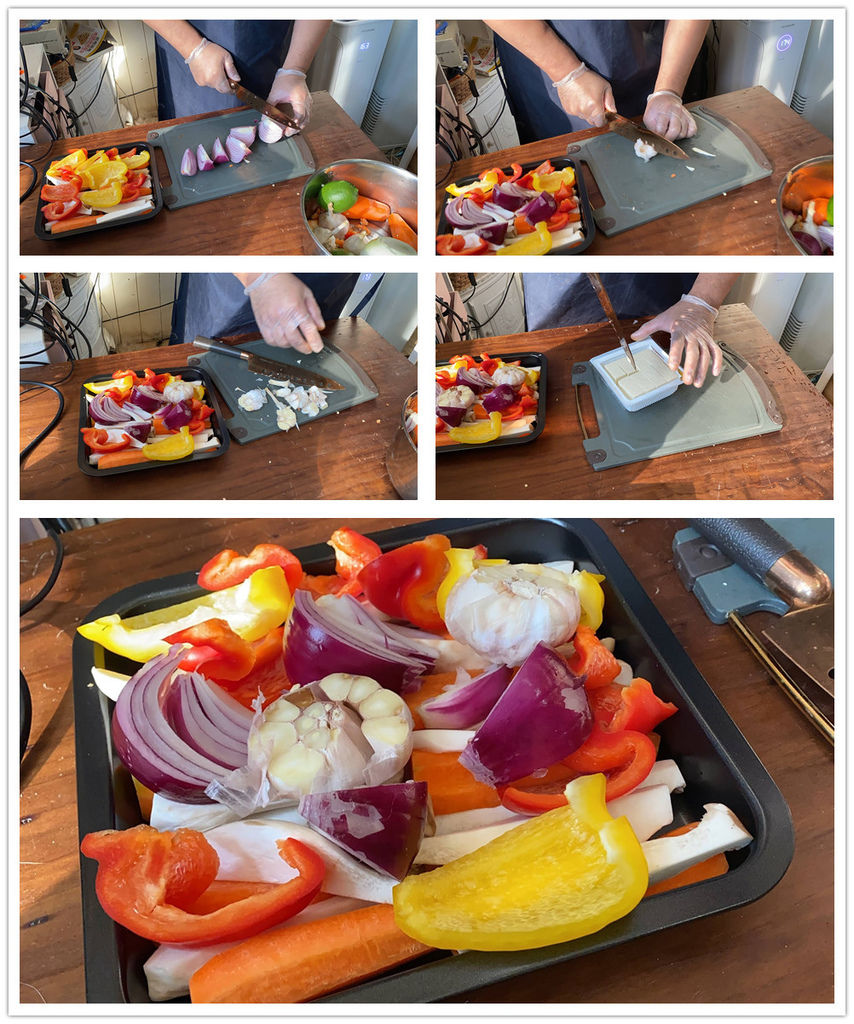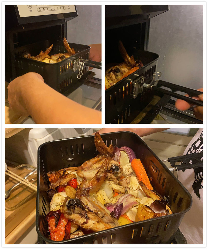 蔬菜也都切成一塊一塊的都放在下盤中,用橄欖油噴罐將油噴灑在蔬菜上面,或是把烤雞的油汁淋到蔬菜上剛好增添蔬菜的鹹味,如果重口味再撒上胡椒鹽就是一道美味料理。