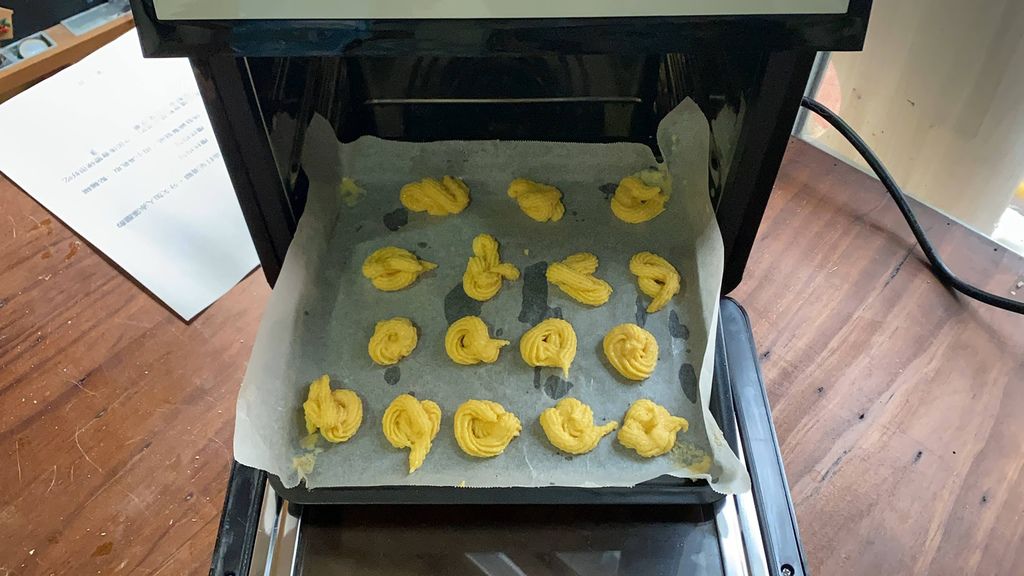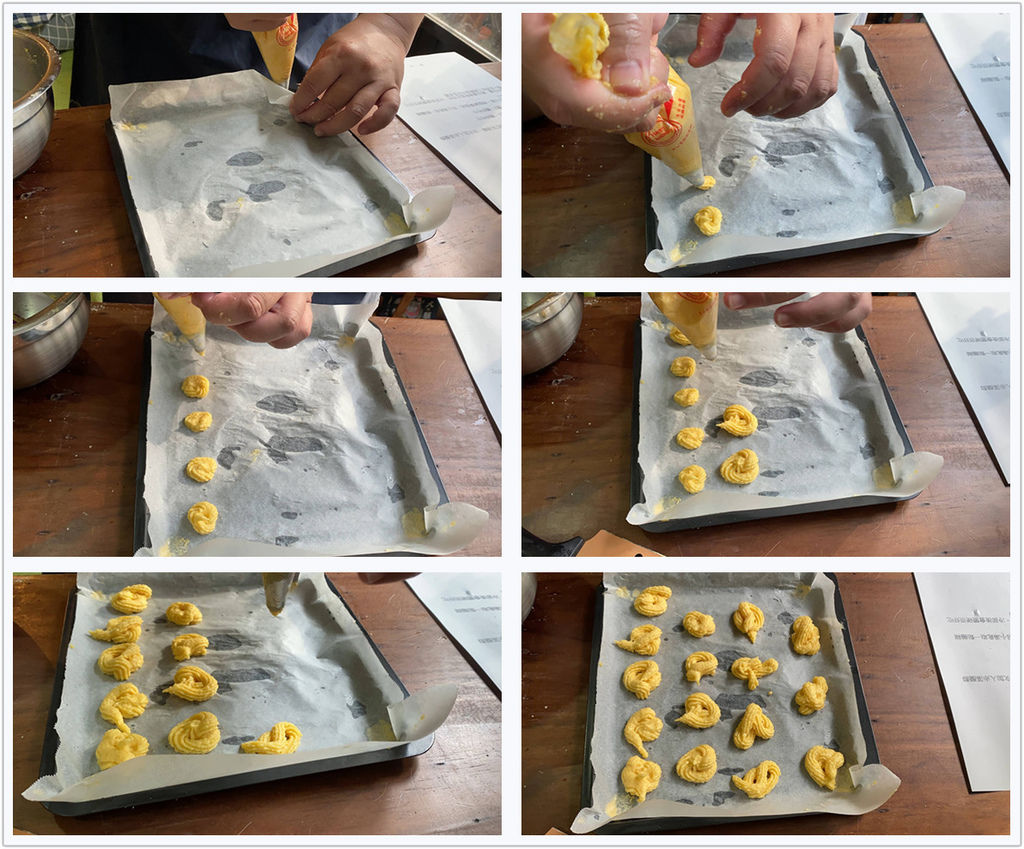 烤盤鋪烤紙,四個角落擠上麵糊到烤盤上固定烤紙,然後就開始擠麵陀,一坨一坨的要分開,不然就會黏在一起,然後發現擠得好醜~ = =