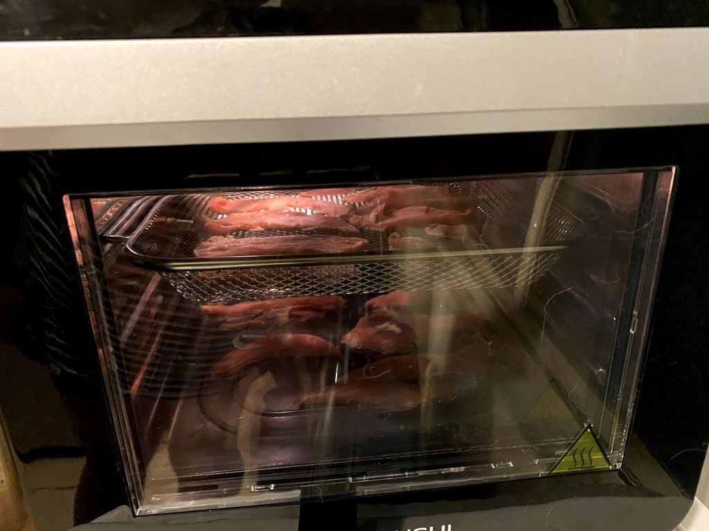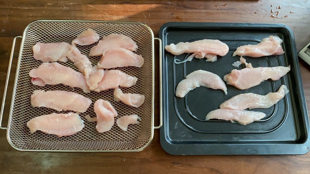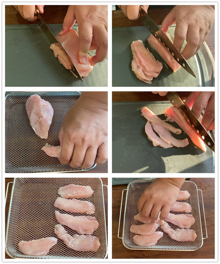 準備雞胸肉經由解凍之後,將雞胸肉切成長條狀撲滿烤架上,上下兩層就可以烘烤兩片雞胸的份量。