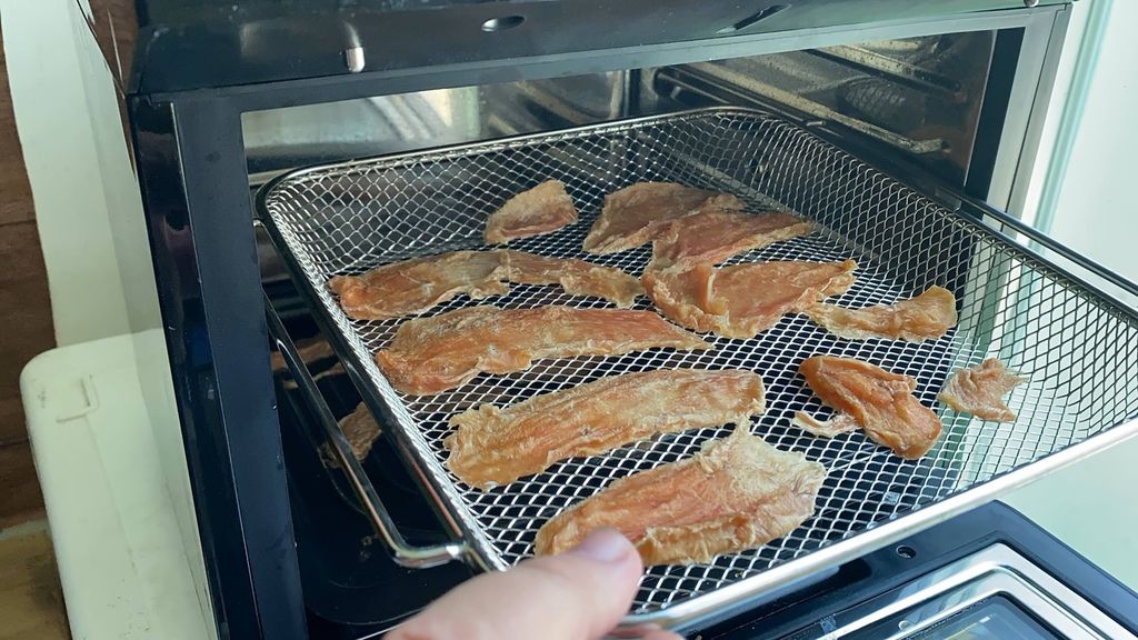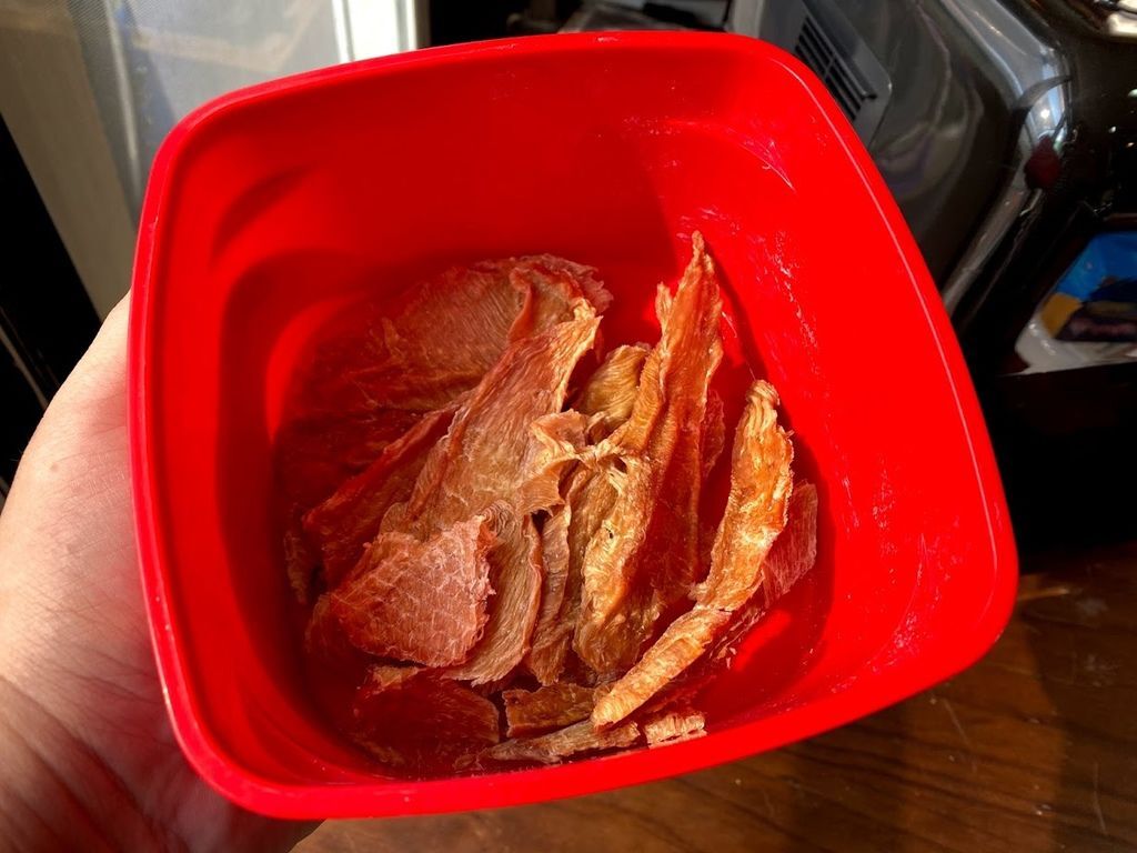 經由 山水氣炸烤箱 烘烤完成之後,成品香脆就連AC 看到都很想吃,肉乾放在保鮮盒裡可以在常溫下保存。