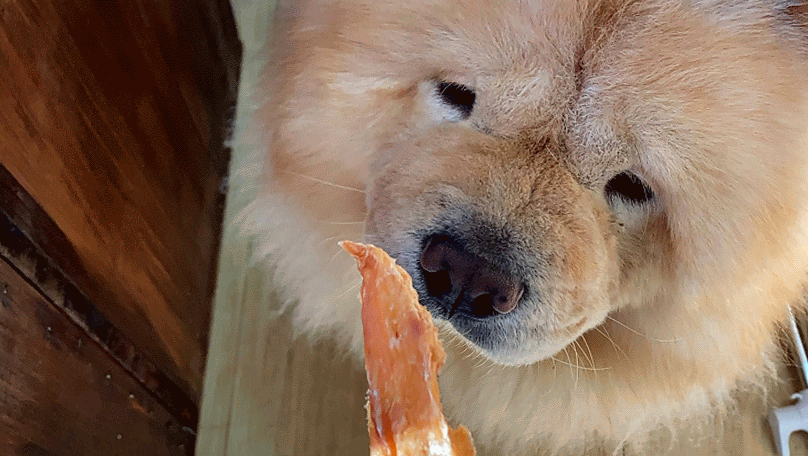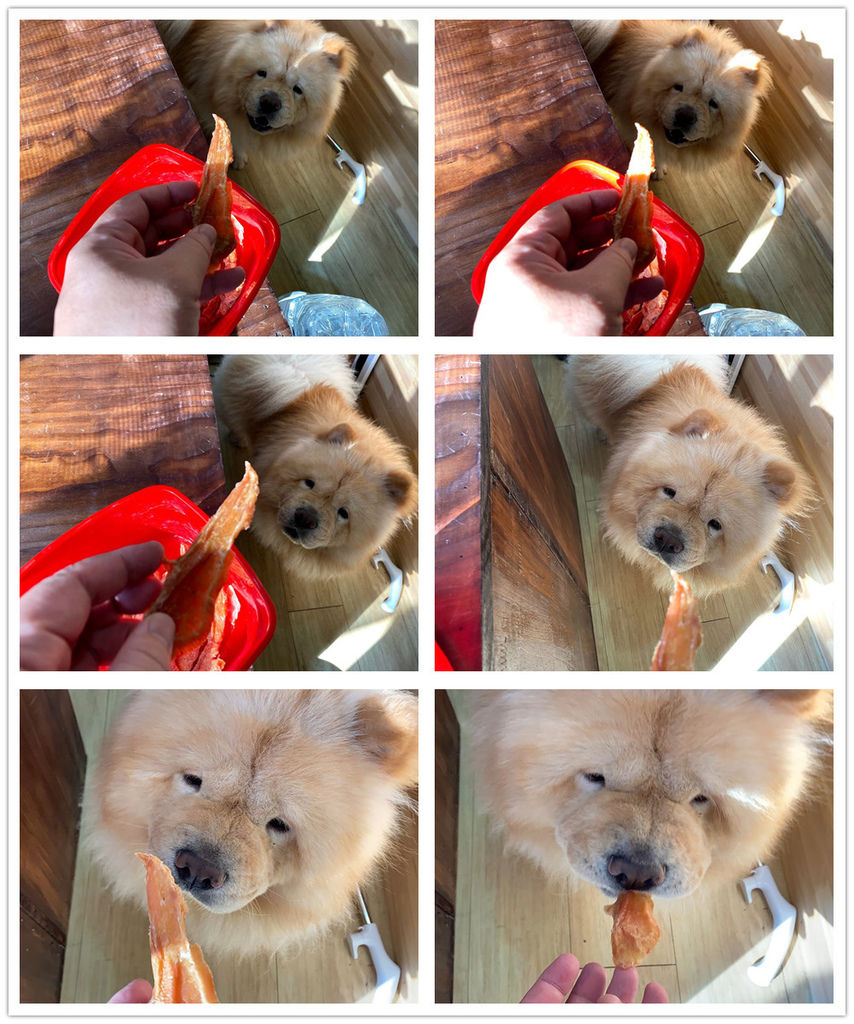 堡堡似乎已經期待很久了,竟然會主動坐下來乖乖的等肉乾,真可愛~ 看堡堡吃的這麼開心 以後就可以常常做給他吃了。