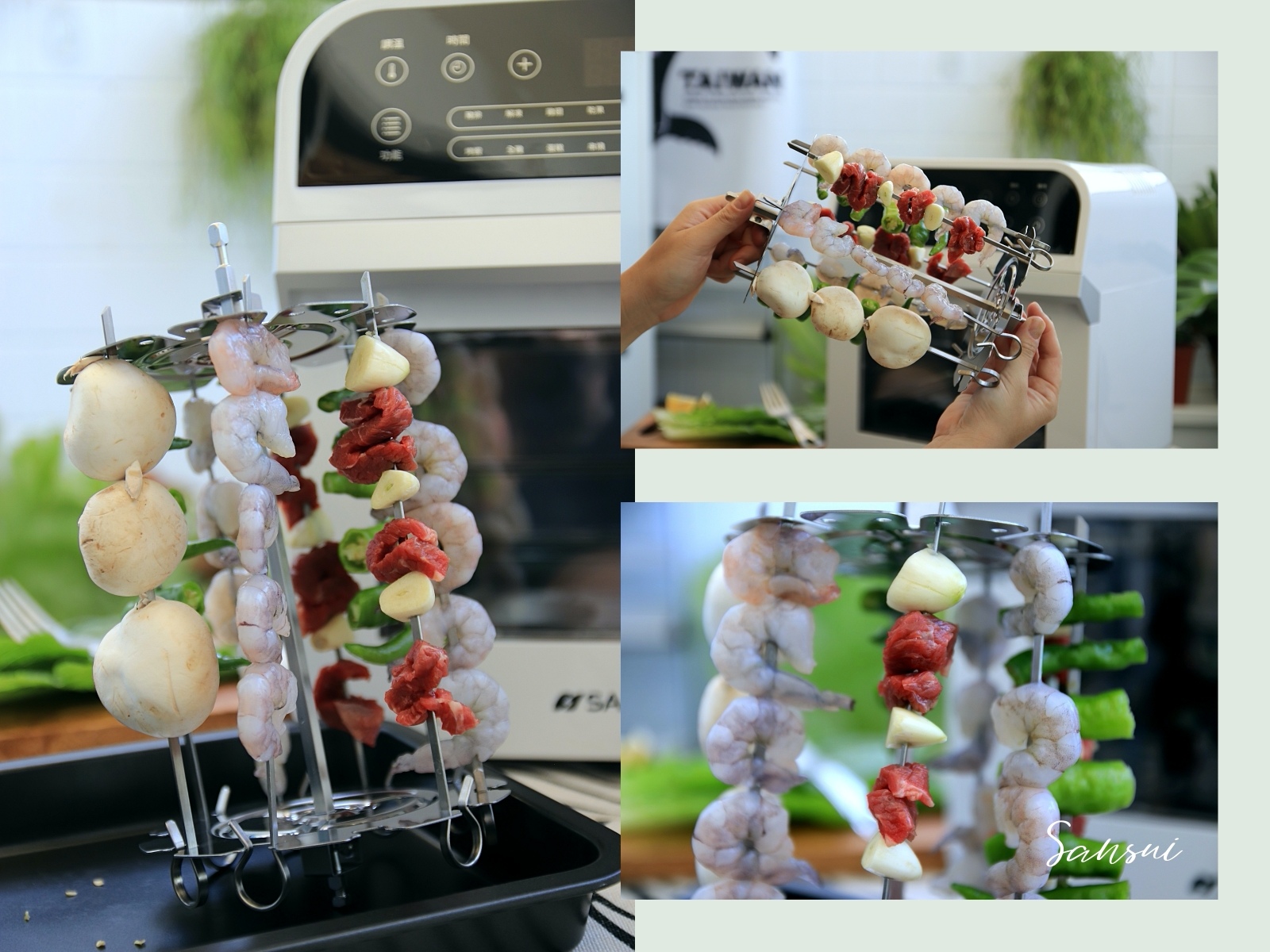 「SANSUI 山水氣炸烤箱」的烤串叉、叉燒架非常方便,