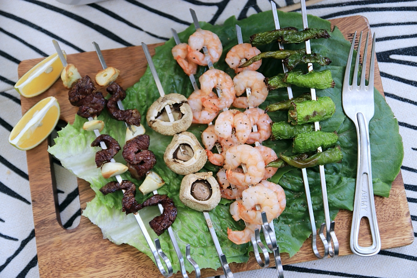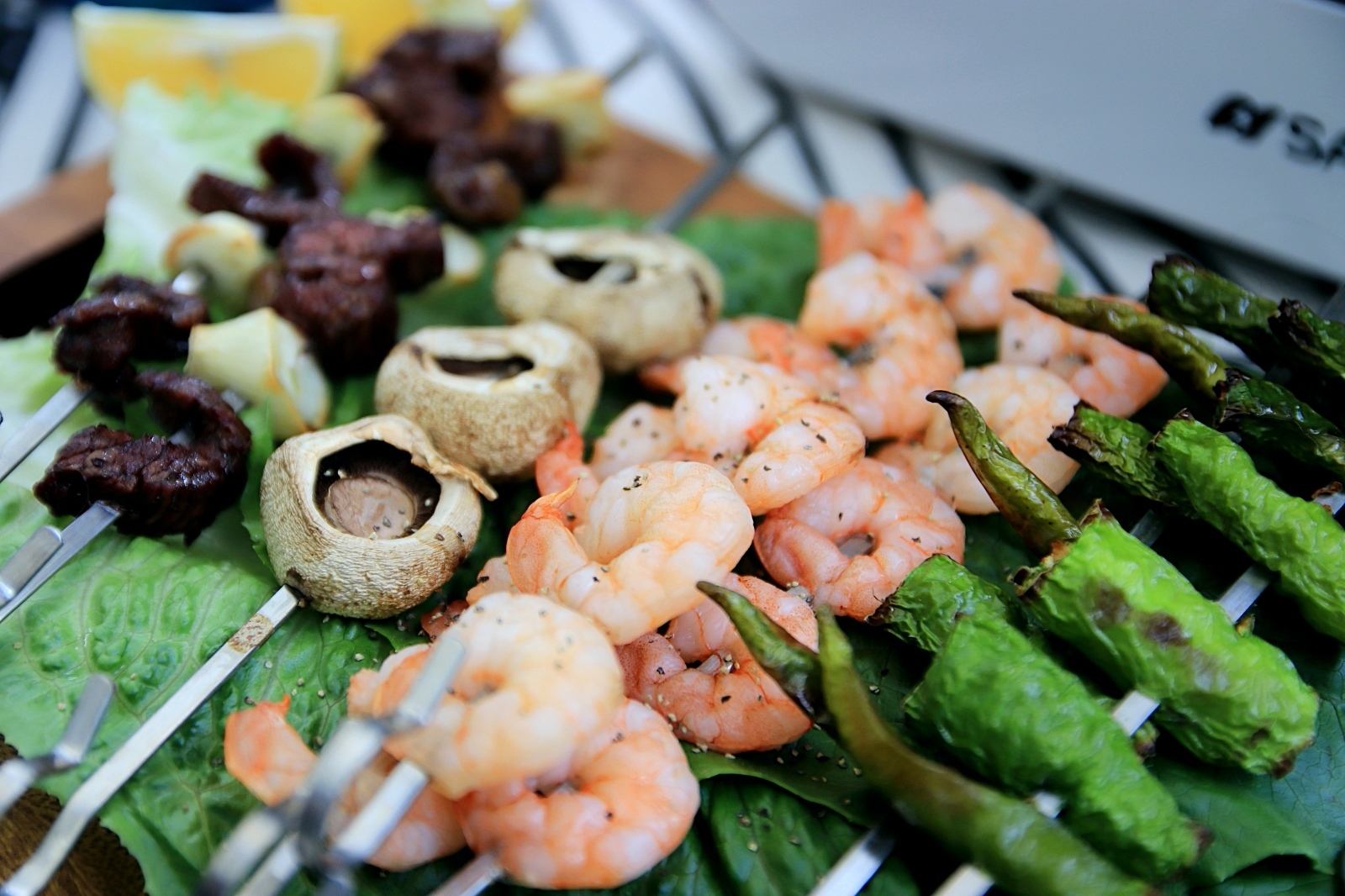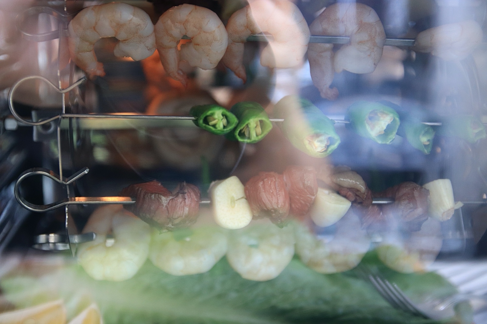 像是我們就偏愛原汁原味!牛肉和蒜頭一起烤、蝦仁直接串滿一整串,就連蔬菜青龍、蘑菇也不用思考多少,通通串起來 XDD