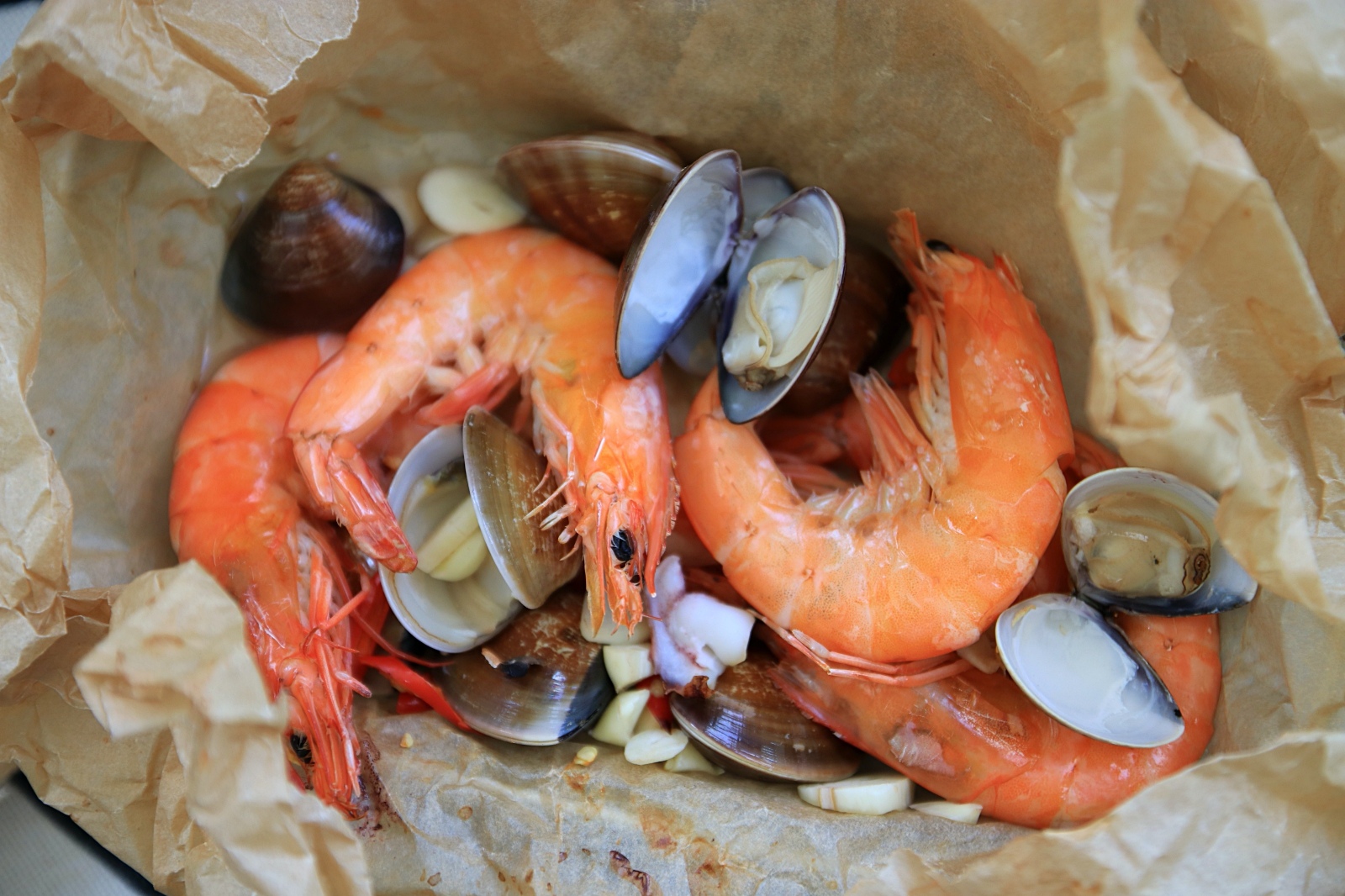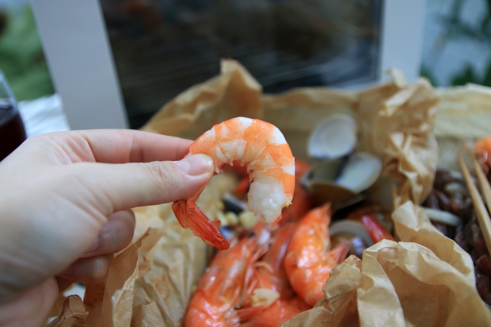 高溫烘烤後每隻蝦子都紅通通,蛤蠣也會打開嘴巴,料理紙打開的那一瞬間,香氣四溢、滿滿大海的鮮甜味啊