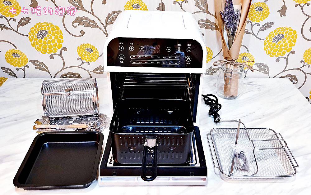 它結合了「氣炸鍋+烤箱+麵包機+電烤盤+乾果機 」的功能。