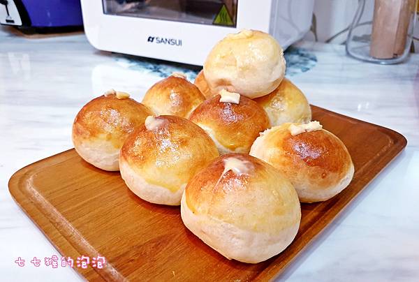 食材準備: 雞蛋1顆+牛奶至180g、高筋麵粉200g、低筋麵粉50g、糖25g、酵母3g、鹽半茶匙、無鹽奶油20g、起司或奶油少許。
