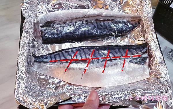將魚背如下圖紅線稍微劃開,底下各壓2片薑片去腥,鹽巴可抹可不抹,我個人是習慣不抹。
