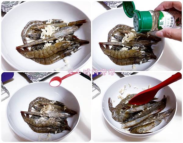 加入些許蒜末、胡椒、鹽巴,再把香料和蝦子攪和均勻。