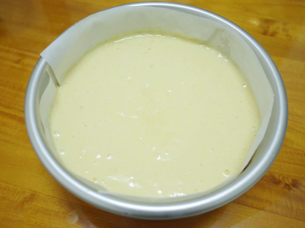 5. 倒入蛋糕模後,可在桌上輕敲幾下消除氣泡
