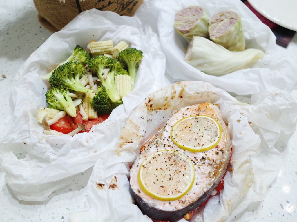 -淋上檸檬汁,在鮭魚上放上兩片檸檬片,用烘焙紙捲起來