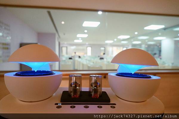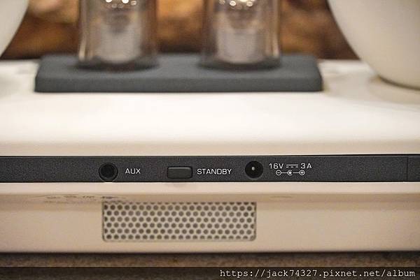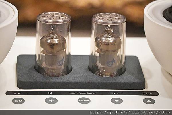 完美的霧面白色機型,左右兩側的半圓形的喇叭單體、中間的真空管,以及簡約的觸控面板設計,