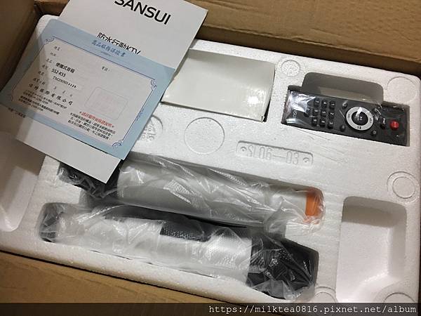 一打開他們的箱子就可以看到上層附的配備,包含「無線麥克風兩隻」(每一隻需再自行裝上兩顆AA3號電池)、「遙控器一隻」(需再自行裝上AAA4號電池兩顆)、「電源供應器一個」、以及說明書一份。
