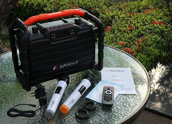 這台SANSUI 山水 重低音戶外手提行動KTV SS2-K55全配備包含主機、遙控器、無線麥克風兩隻、麥克風支架、電源充電線,使用說明書和保固卡。