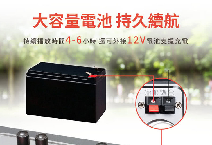 就像是手機一樣「SANSUI山水15吋觸控螢幕桿式行動KTV 型號SKTV-T888」內建大容量4000mAh鋰電池,電池可以外接電源充電,大約花三個小時就可以把電池充飽了,耗電量也跟手機一樣如果只是看看影片聲音不大大概可以用到六個小時,待機時間長不太耗電,如果火力全開用到四個小時綽綽有餘,如果這樣都不足夠還可以帶個可外接12V電池來充電,續航力怎麼看都跟手機一樣方便夠用。