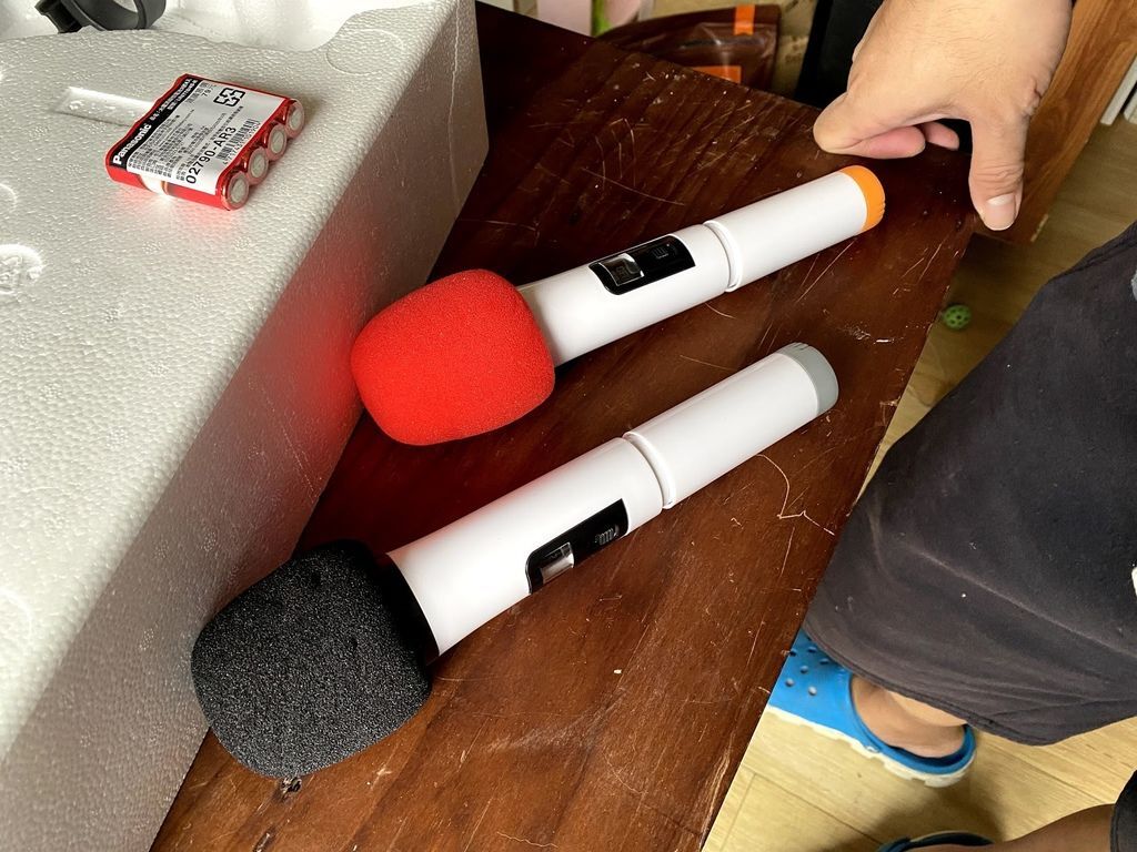 兩隻小白麥克風質感很好,沒有麥克風線的束縛,白色外型很跳與機身黑色剛好成對比,有兩支麥克風不怕搶著唱,麥克風很輕簡單順手,轉開麥克風塑料的外殼把電池裝進去之後,完全不用設定就馬上連接到「SANSUI山水15吋觸控螢幕桿式行動KTV 型號SKTV-T888」,就跟到錢櫃KTV 的無線麥克風一樣,而且也備有防口水噴沫的紅色黑色保護套,麥克風的中央有個電池電量顯示功能,不用擔心唱到一半就沒電了。