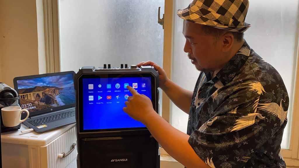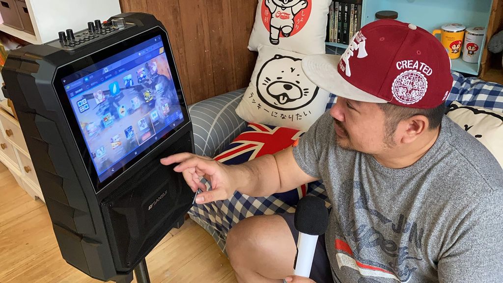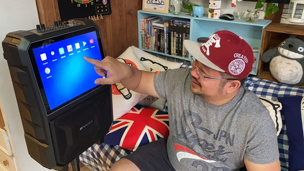 「SANSUI山水15吋觸控螢幕桿式行動KTV 型號SKTV-T888」可以說選單功能非常強勁,自娛娛人的娛樂工具,裡面有內建的YOUTUBE 可以撥放音樂影片、也有付費的電影APP、下載好的兩款唱歌APP、錄音APP、自己也可以下再一些常用的APP,比方LINE 或是FB 整個面板就像是一台小電腦一般,多人同步點歌,滿足兩隻熊的各種影音需求。