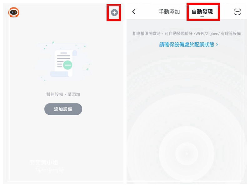 設好帳號後可以看到畫面右上方有一個"+",添加設備,再來選"擇自動發現",記得要開藍芽及WIFI功能喔