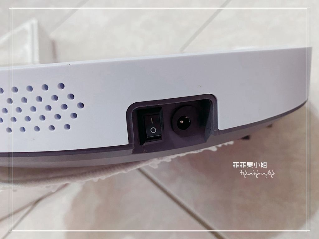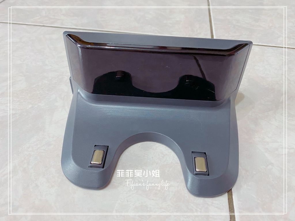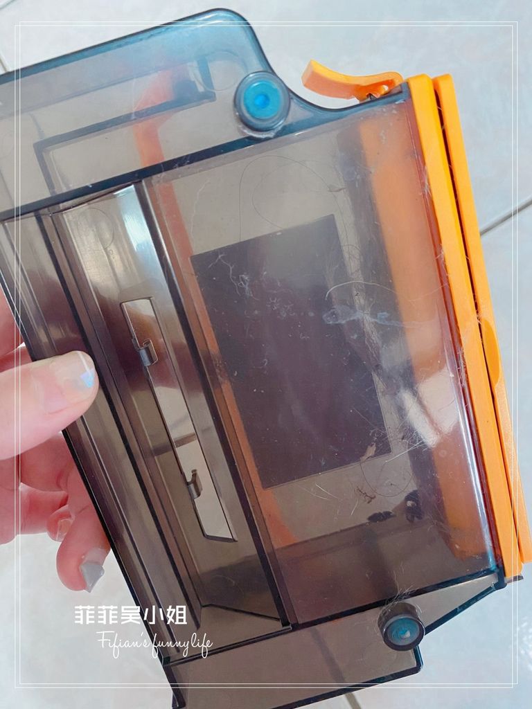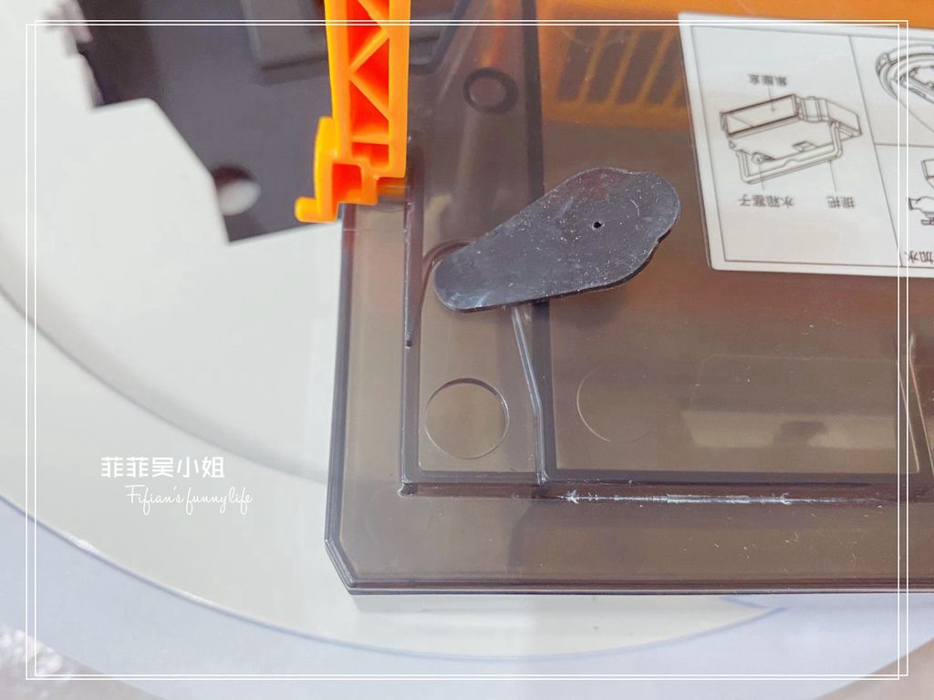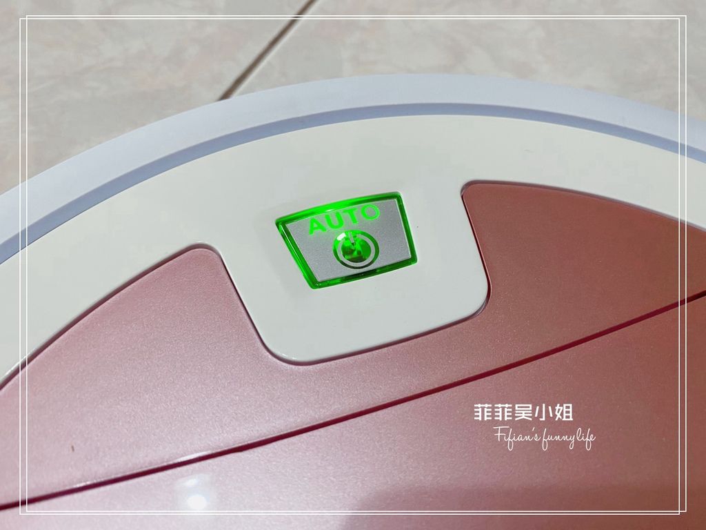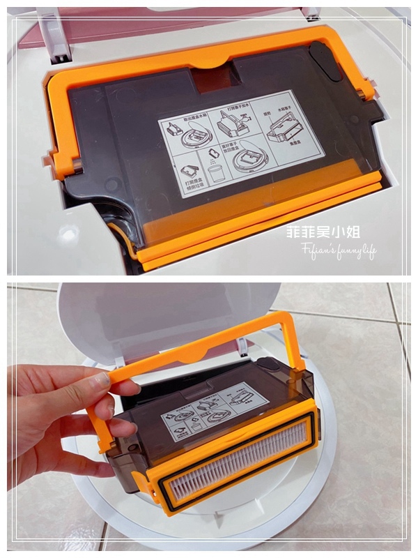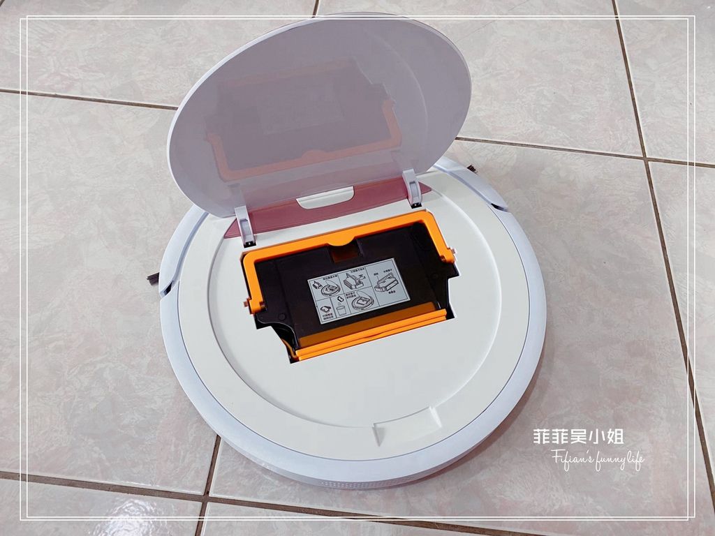 掃地機器人中心的翻蓋是耐看的霧面粉紅,菲菲好喜歡(手比愛心),掀開翻蓋可以看到內嵌一個塵盒水箱