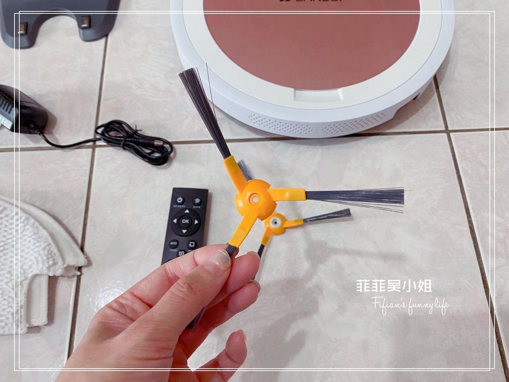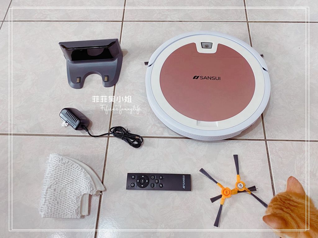 開箱囉!SANSUI山水 WIFI智能超薄濕拖掃地機器人SW-Q5+的配件非常簡單,內容物有: 主機*1,充電座*1,電源充電線*1,遙控器*1,抺布*2,邊刷*4