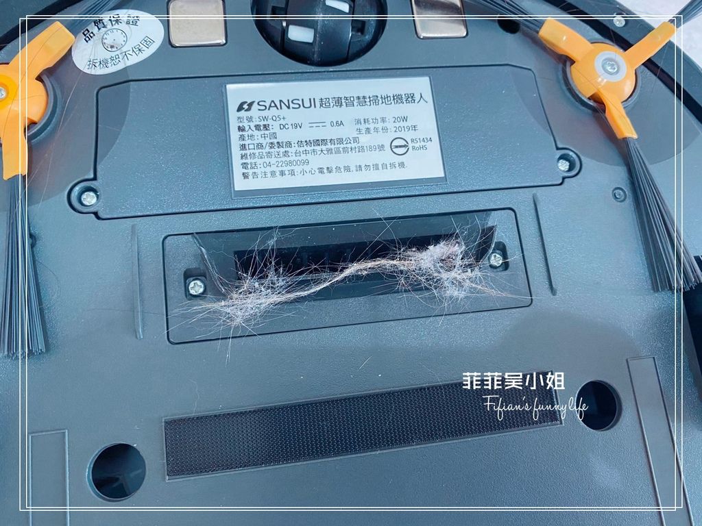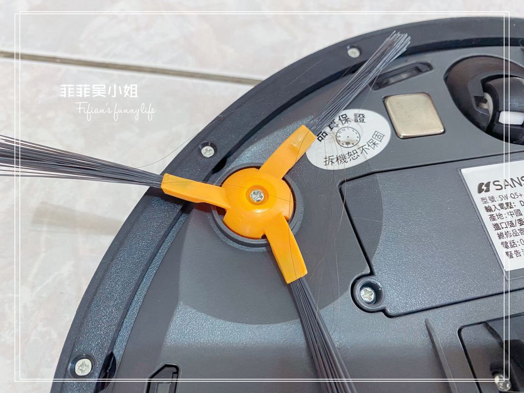 可以看到背面的塵盒裡有好多毛髪及灰塵,吸塵口也卡了好多貓毛!!!側邊的邊刷上更纏了好幾根頭髪。這款SW-Q5+的吸力有1000Pa,我們家除了掃地機器人外,還有另外的手持式吸塵器,交互使用的情況下這吸力對我們家來說很夠用。