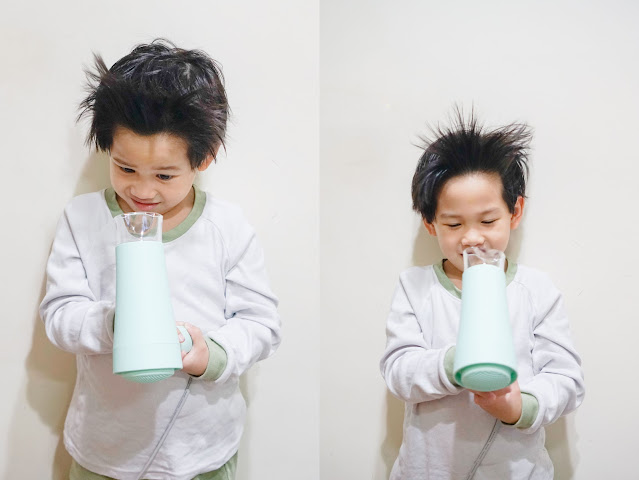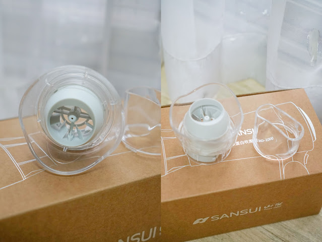旋轉吹嘴裡面有棉墊容器,從卡榫拿出網狀造型的容器,打開後滴入膠原蛋白玻尿酸美髮液。