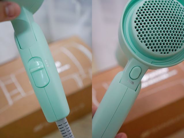 吹風機握柄中可上下調整兩段風力,後方還有冷熱風的控制,輕便好調整。